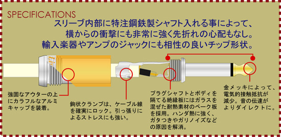 低ノイズでオープンなサウンドを実現する高級OFC銅芯線を採用したケーブルと、カラフルなアルミパーツを装着した高い耐久性を誇るオリジナルプラグを組み合わせ、 「音」とファッション性」を融合した新しいコンセプトの国産ハイブリッド・ケーブル。