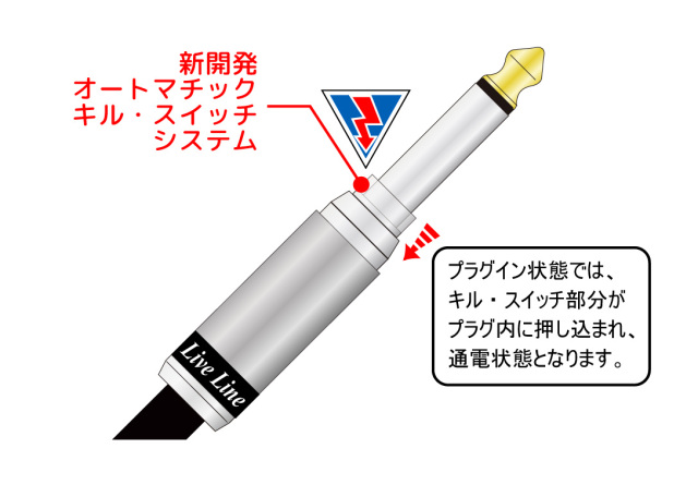 プロミュージシャンの現場要望から生まれ厳しいテストを経て商品化された当プラグは、アンプのスイッチやペダル音量などを下げる事無く、 通常のプラグを抜き差しする感覚でスムーズな楽器の交換や持ち替えを可能としました。
