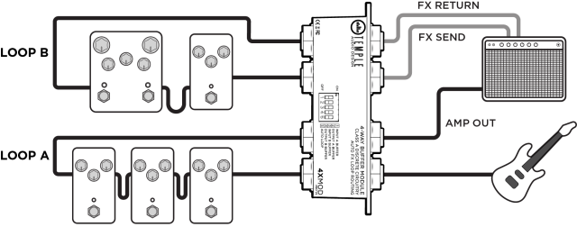 4つのバッファーを備えたコンパクト・モジュール。 4ケーブル方式を採用しているアーティストにとっては、エフェクトループの有無にかかわらず、アンプ間のルーティングを簡単に切り替えることができる素晴らしいモジュールです。